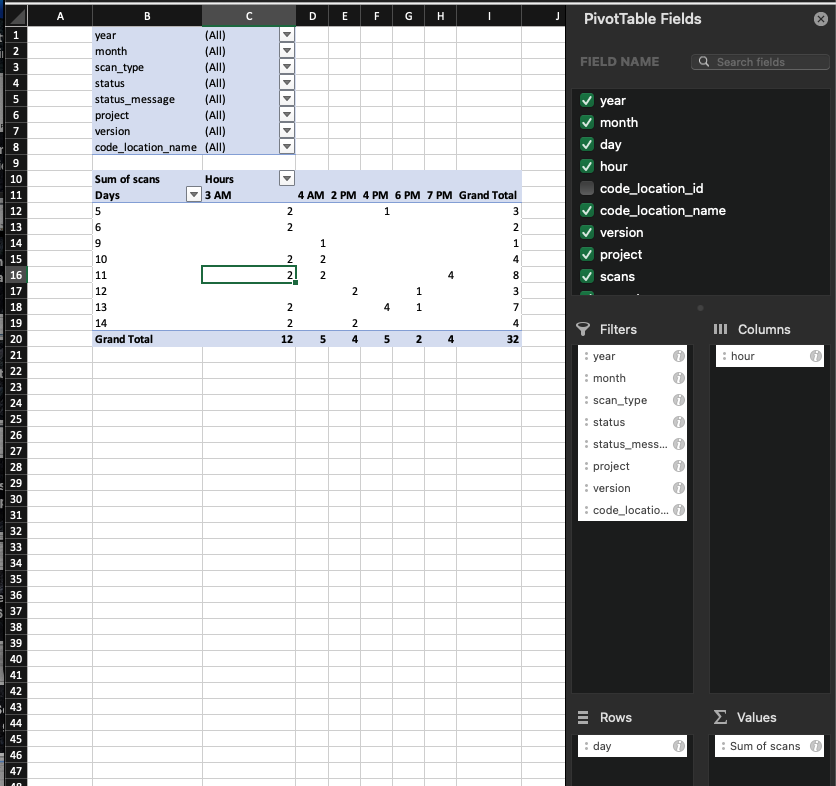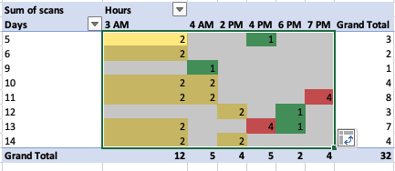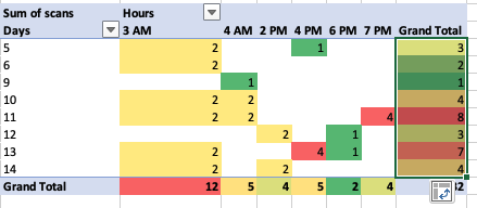 Select all the cells that fall within the range between the first to last Hours column (do not include filter top row, ‘Grand Total’ bottom row or last column (Grand Total)
