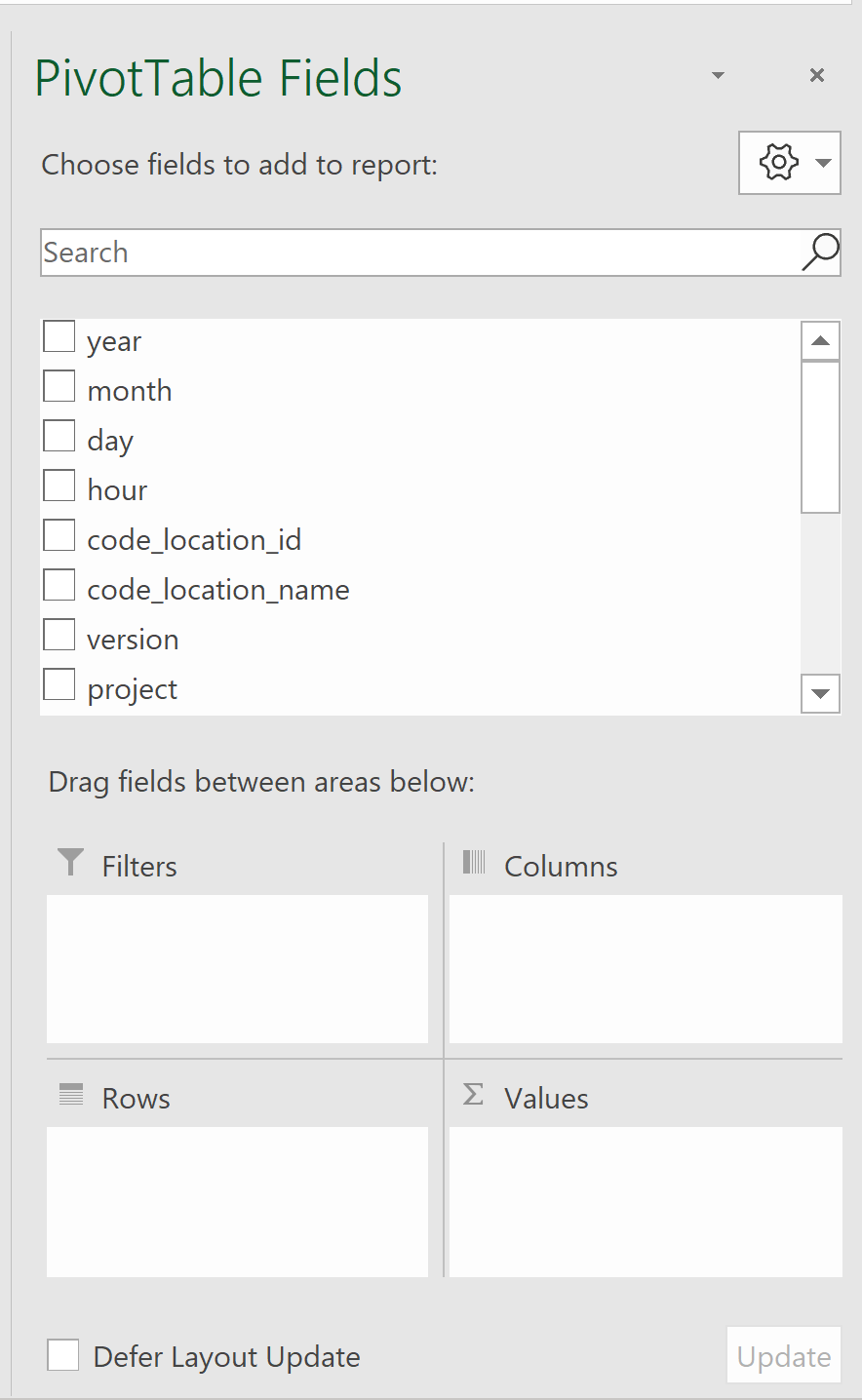 Click in the Blank Pivot created, this should open the PivotTable Fields column panel.