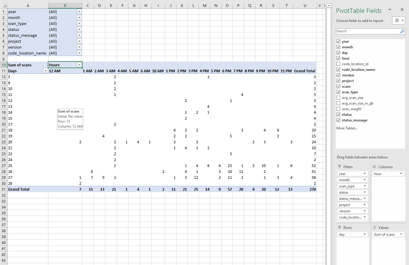Drag the Scans field to the Values section. It should show as ‘Sum of Scans’.