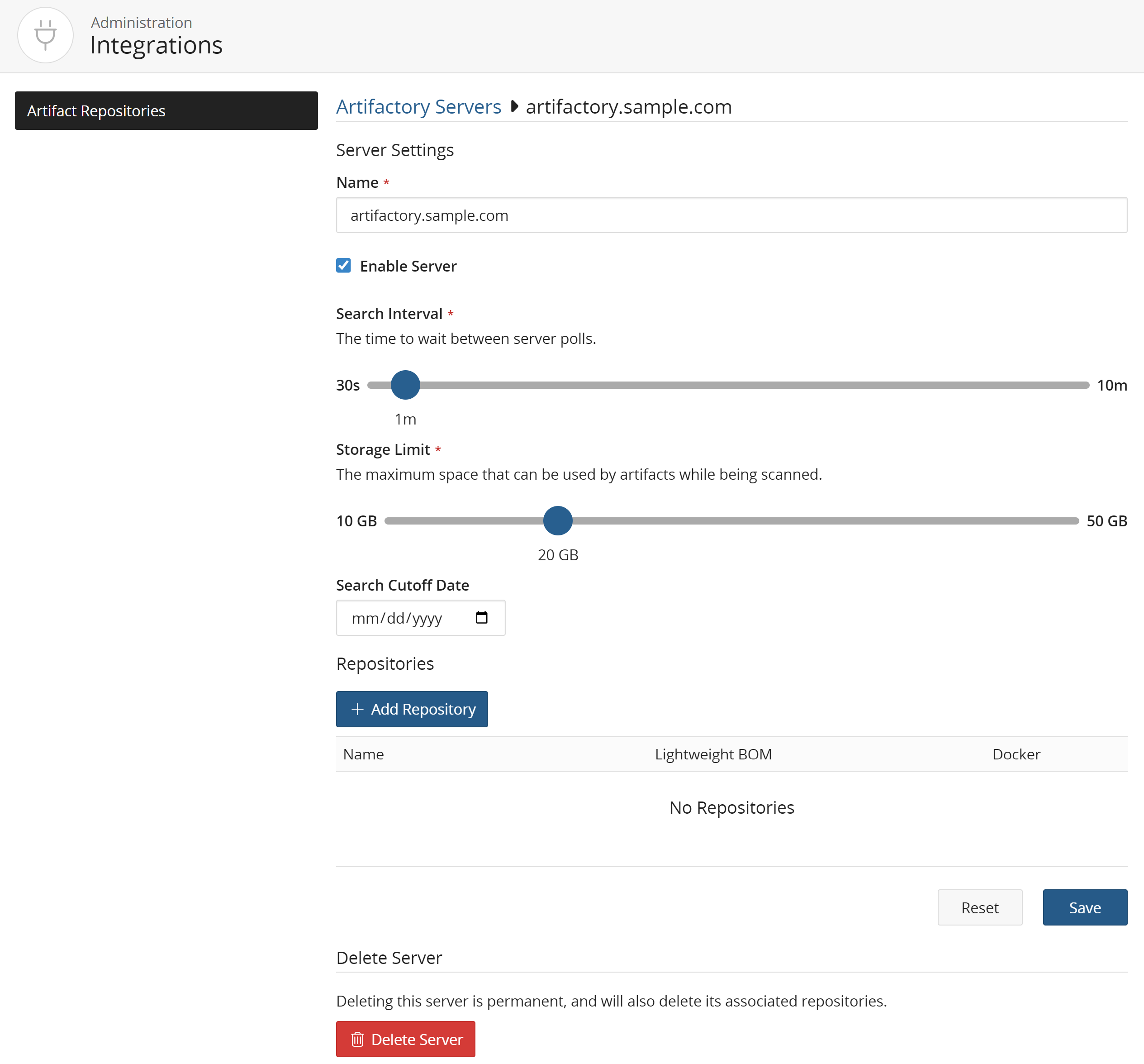 From the Integrations page, you can add an Artifactory server by following the steps below: