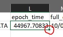 Column name Formula epoch_time =DATEVALUE(MID(A2,1,10))+TIMEVALUE(MID(A2,12,8)) full_date =INT(L2) actual_hour =L2-M2 year =YEAR(L2) month =MONTH(L2) day =DAY(L2) The end result should end up looking something like this: