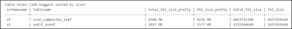 Find the total_tbl_size value for the audit_event tablename in the Table Sizes table.