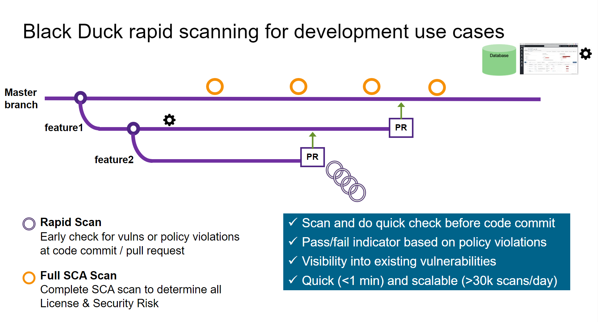 Rapid scanning (dependency scan) provides developers with an efficient method to check for vulnerabilities or policy violations in their code prior to merging, without having to create a BOM in Black Duck.