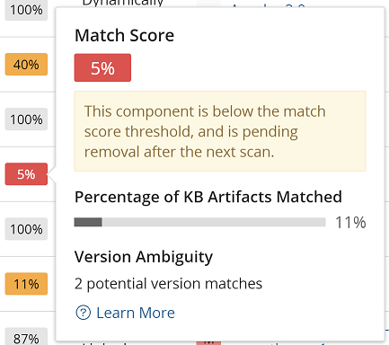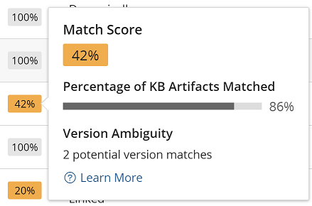 Percentage of KnowledgeBase artifact matched: This value represents the percent of a KnowledgeBase Download from the BOM Entry's data which matched the customer's scanned data. The KnowledgeBase's representation of the BOM Entry may have many downloads. The % of KnowledgeBase Artifact Matched is based on the Download with the highest percent match to the customer's scanned files.