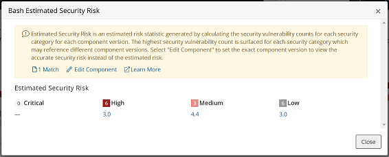 Select a value to open the project version page Vulnerabilities tab which displays the vulnerabilities for that component or subproject. If the component has an unknown version, a modal will be displayed detailing the estimated security risk for the component.