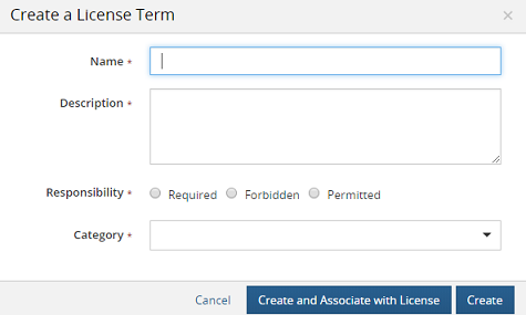 Click Create and Associate with License. The License Association dialog box appears. Select the licenses to associate to this license term, optionally select whether this term requires fulfillment, and click Add. Click here for more information about associating a term to a license.