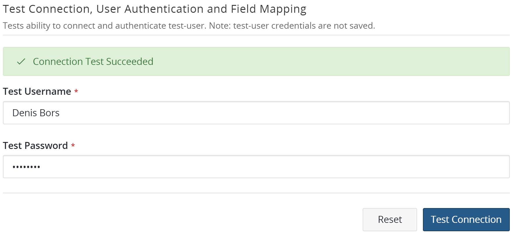 7. Enter the user credentials in the Test Connection, User Authentication and Field Mapping section and click Test Connection.